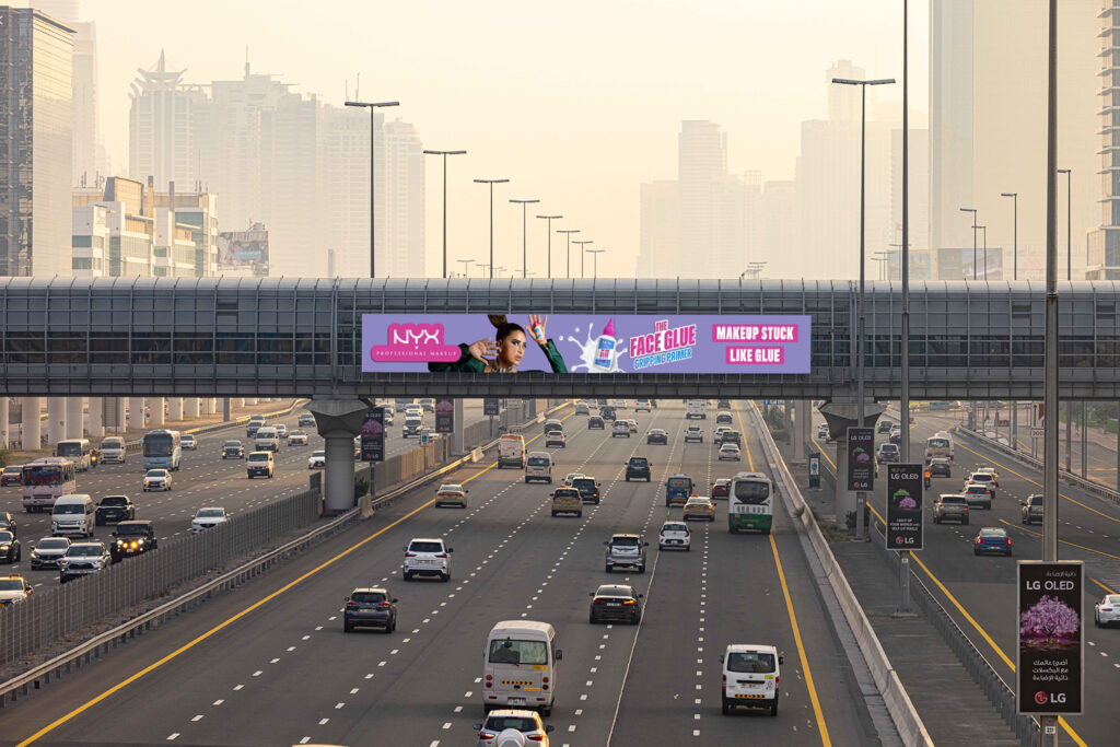 The campaign’s physical presence was as disruptive as its message. At the center: a full wrap of Dubai Metro station. Along Sheikh Zayed Road, 13 massive LED bridges, part of Hypermedia’s “The Artists” collection, pulsed with the NYX Face Glue Primer campaign, reaching millions in one of the region’s most heavily trafficked highways.